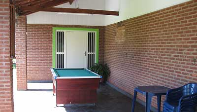 Varanda com espaço para 50 pessoas com churrasqueira de alvenaria, balcão, cozinha e mesa de sinuca.