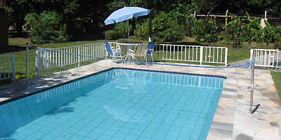Piscina de biribol com deck de pedra, toda cercada com grade. Poço semi-artesiano.
