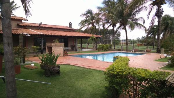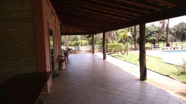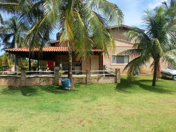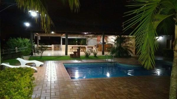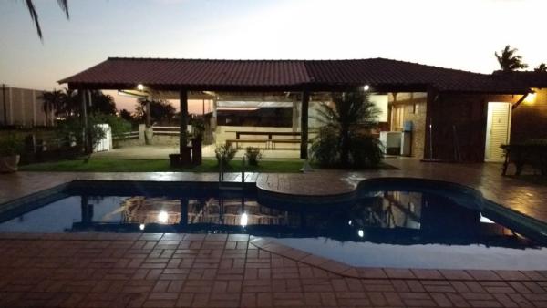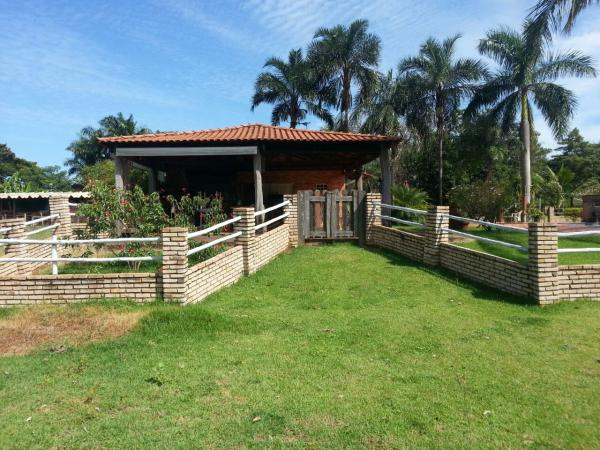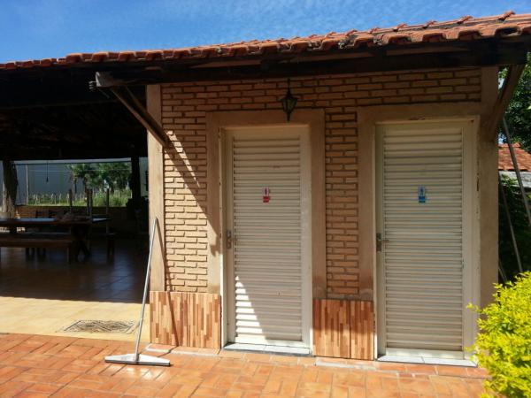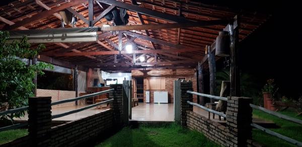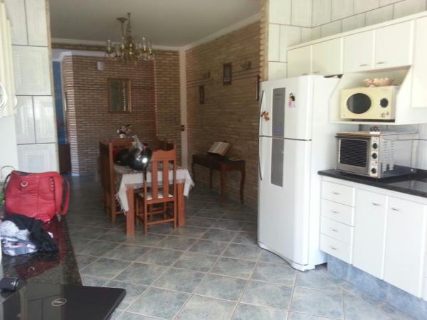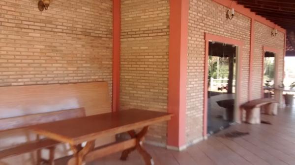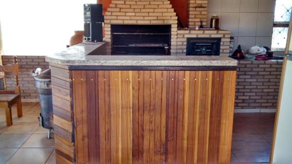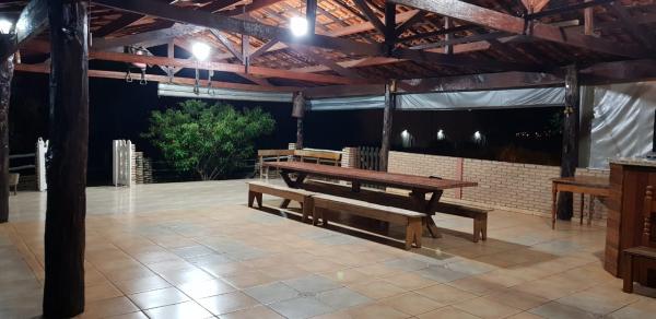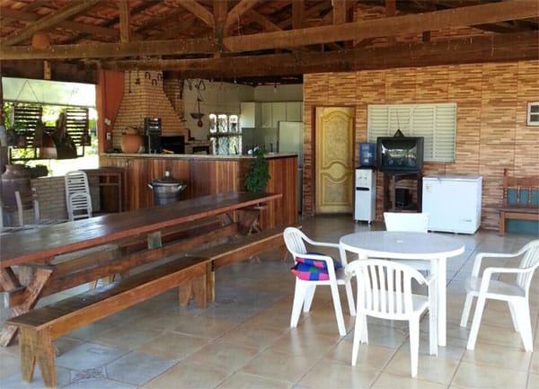 Quiosque com churrasqueira, fogão a lenha, 2 geladeiras, fogão industrial, freezer de 500 litros, fogão de 6 bocas, mesa de madeira rústica com bancos para 20 pessoas.