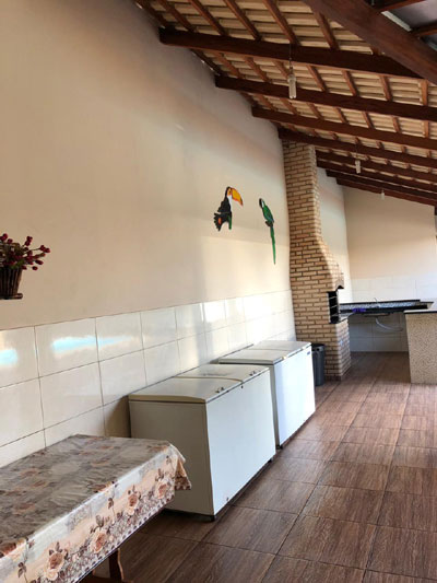 Cozinha interna com fogão de 6 bocas com forno, fogão industrial de 2 bocas com forno e geladeira. Varanda com espaço para festas, churrasqueira de alvenaria, balcão, pia e freezer.