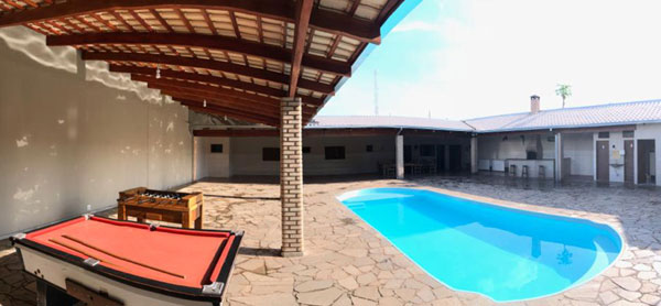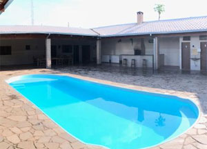 Piscina de fibra aquecida, com escada interna, medida 10x4,20m, pátio de pedra, sanitários masculino e feminino, mini campo de futebol.