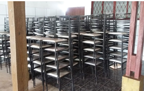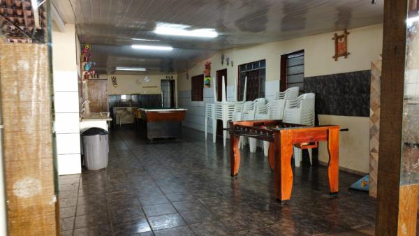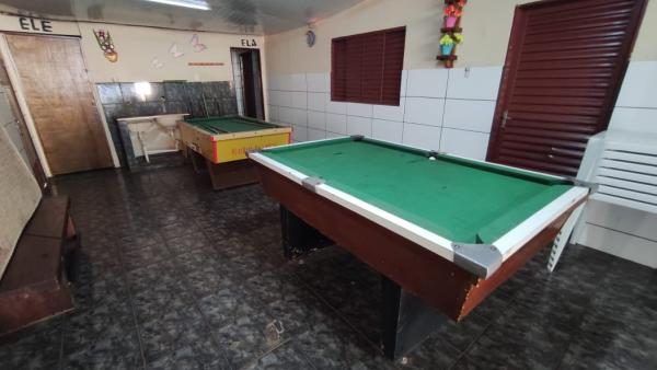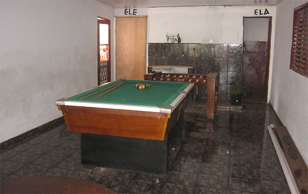 Varanda com 2 mesas de bilhar, pebolin, sanitários masculino e feminino.