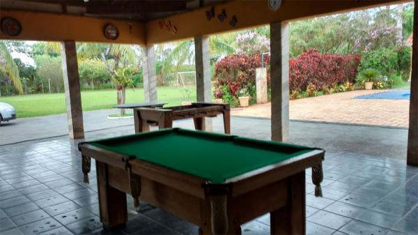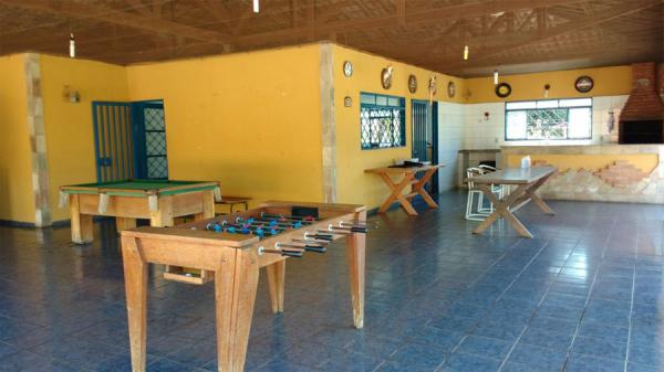 Área para festa com sanitários masculino e feminino, vestiário, mesa de bilhar, pebolim e pingue pongue.