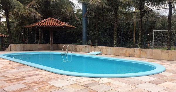 Piscina de fibra adulto e infantil, pátio de pedra e quiosque. Mini campo de futebol.