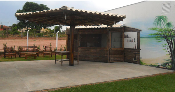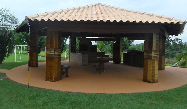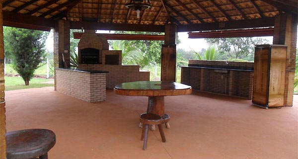 Quiosque para festas com balcão, pia, churrasqueira de alvenaria, fogão e forno à lenha, fogão industrial de 4 bocas, 1 geladeira, 1 cervejeira , 1 freezers, 1 bebedouro. Sanitários masculino e feminino. Varanda com mesa de bilhar, e bar externo com quiosque.