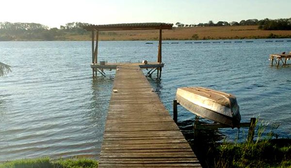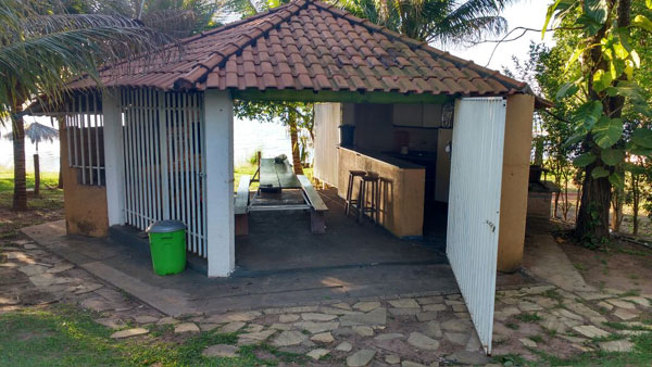 Quiosque na beira d'água com churrasqueira, forno a lenha, fogão de 4 bocas com forno, geladeira, freezer, mesa de refeições para 12 pessoas e sanitário. Piscina de fibra com escada interna, ducha fria, pátio de pedra e cerca viva.
