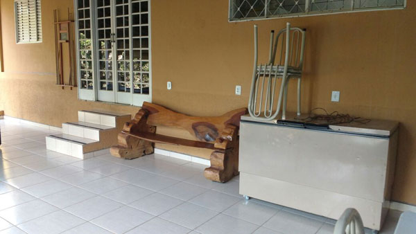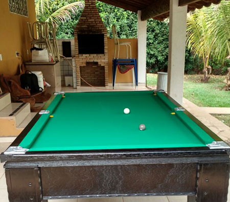Varanda com churrasqueira de alvenaria, mesa de pingue-pongue, mesa de bilhar e cadeiras de descanço.