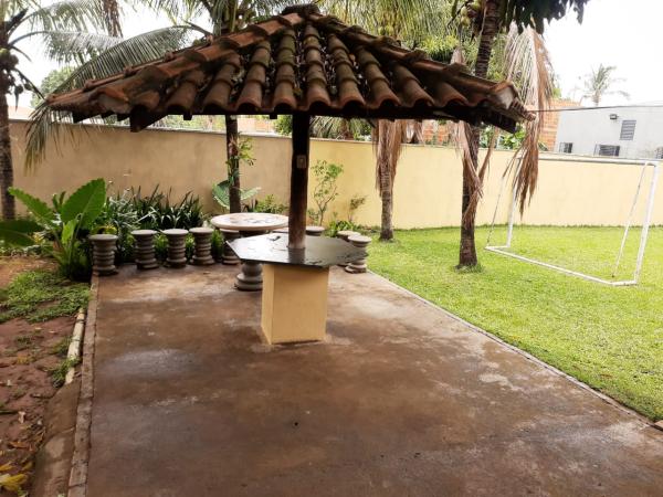 Varanda com churrasqueira de alvenaria, geladeira, freezer, mesa de refeições e mesa de bilhar.