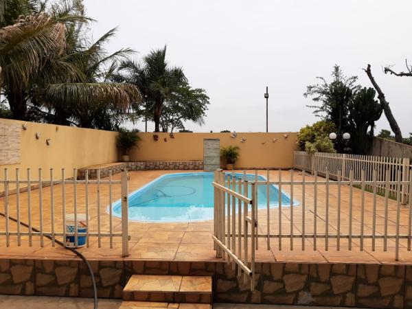 Piscina de fibra com escada interna, cascata, pátio de pedra, mesas com cadeiras e guarda-sol, toda cercada.
